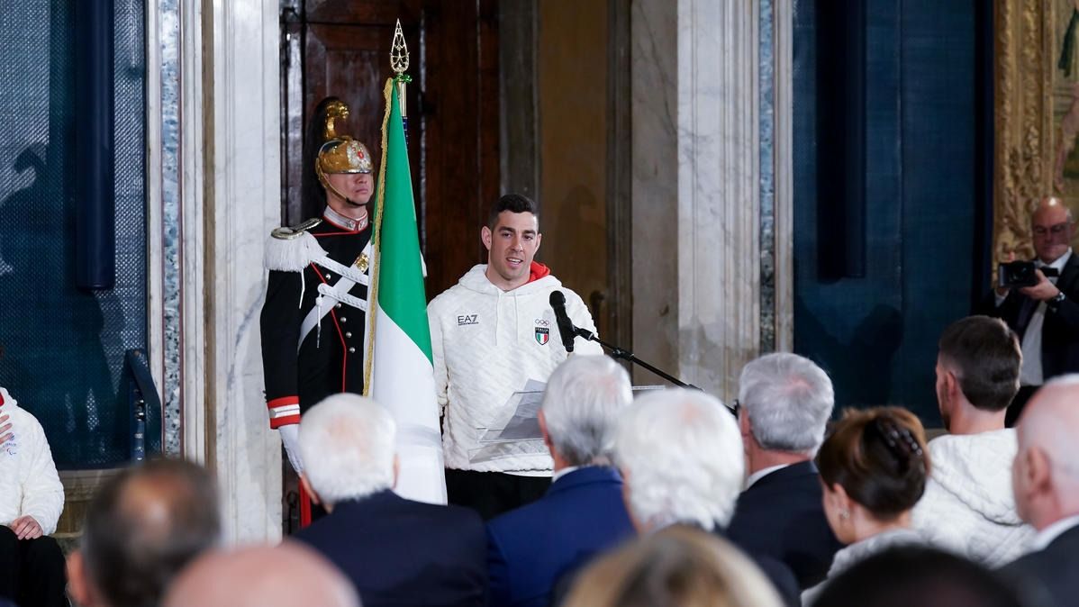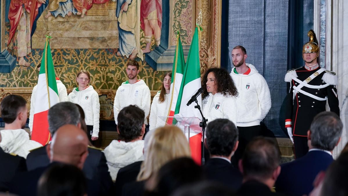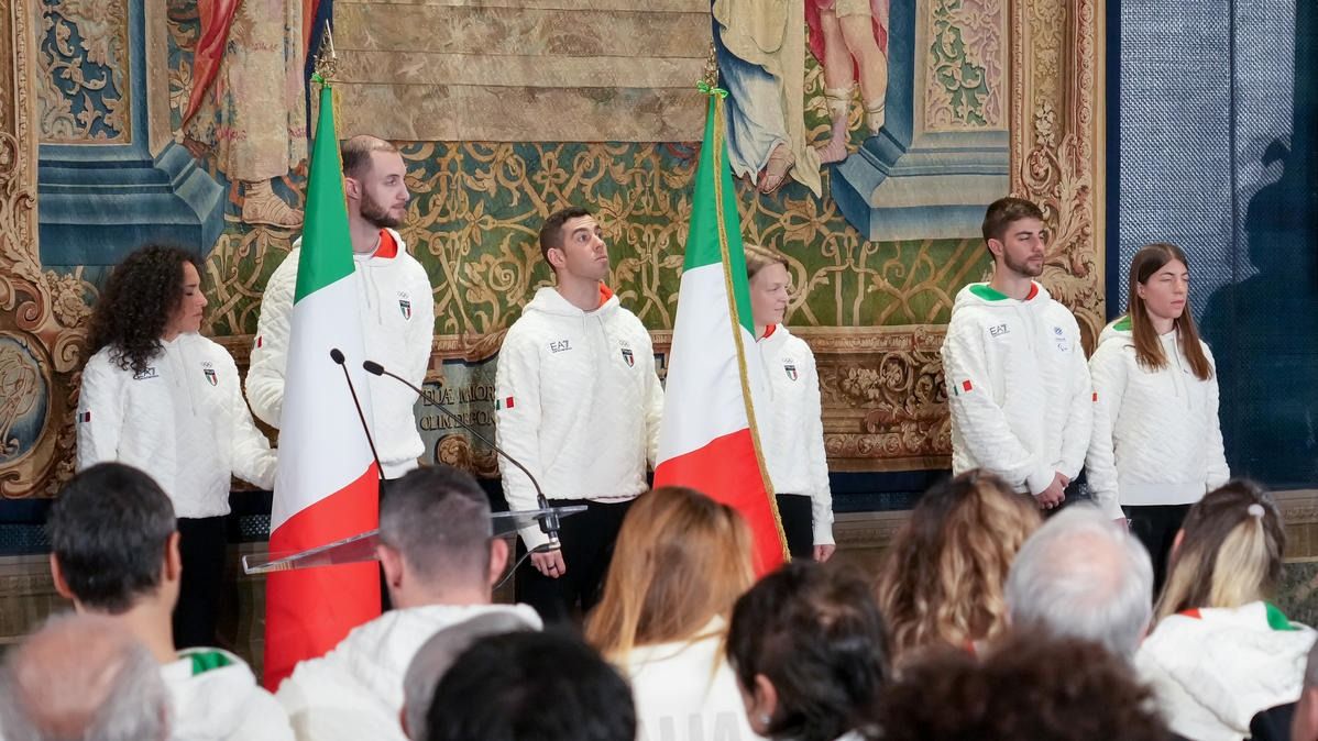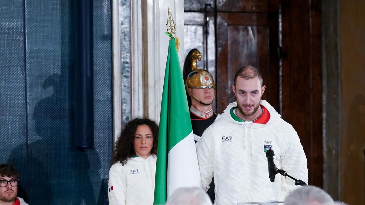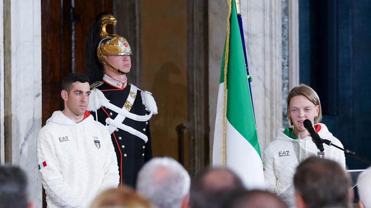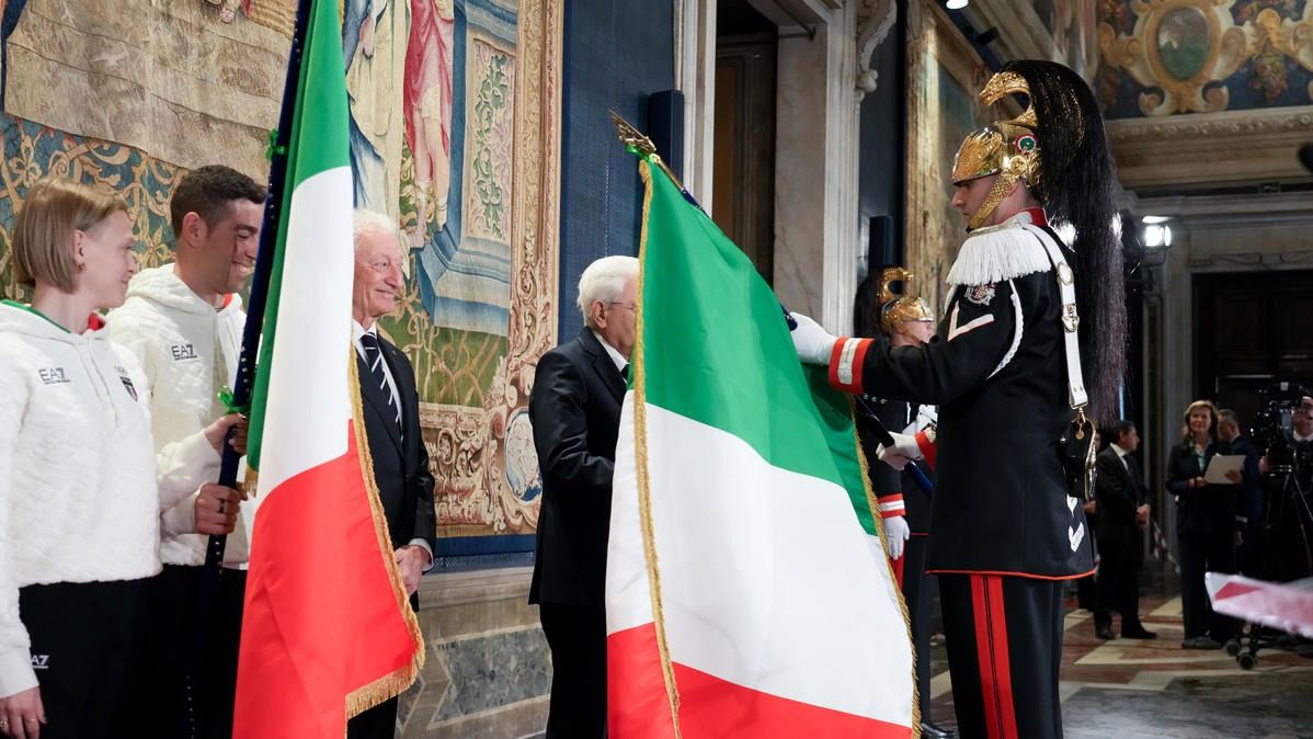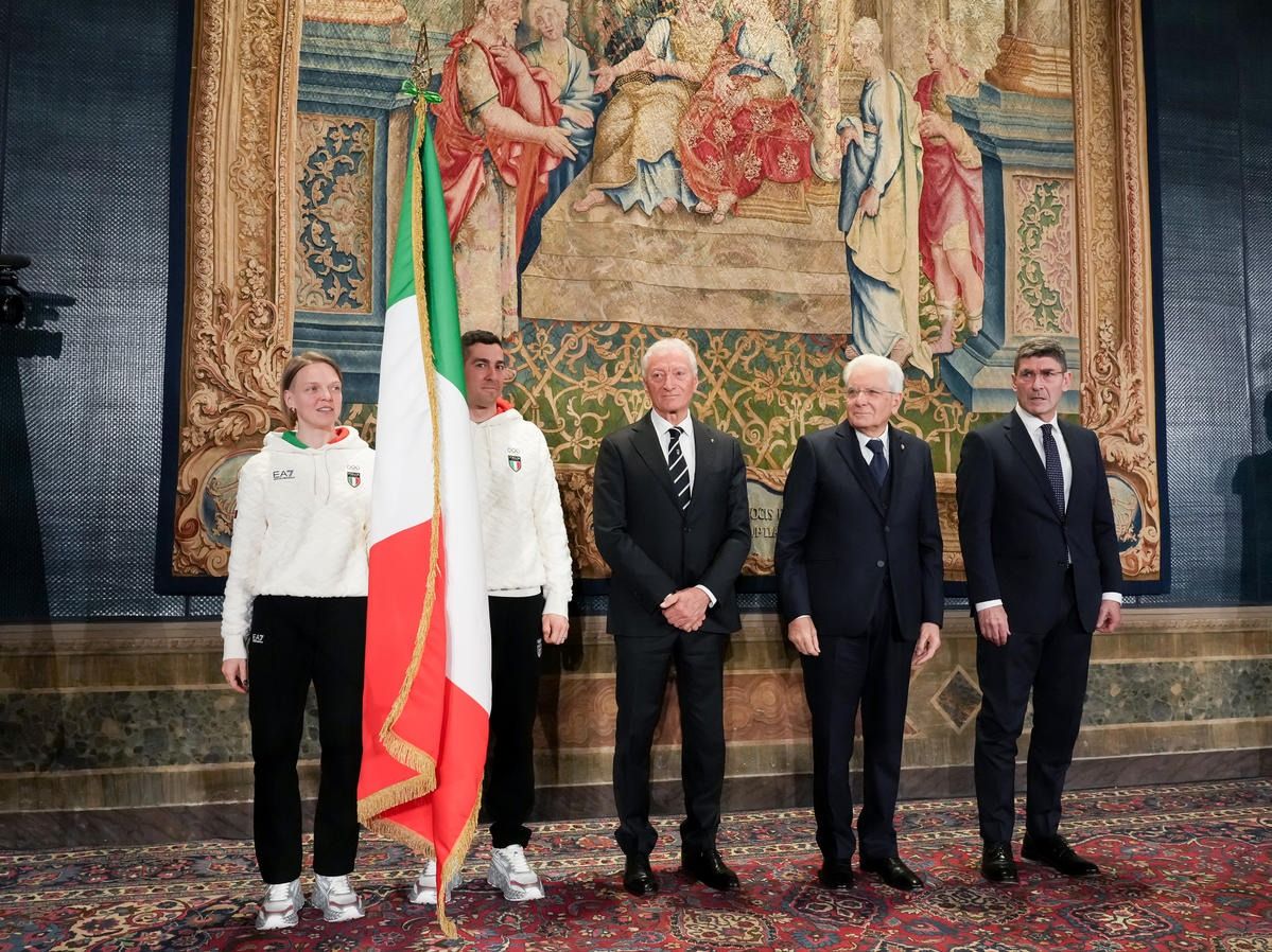 Il Presidente della Repubblica Mattarella consegna il tricolore ai portabandiera di Milano Cortina 2026